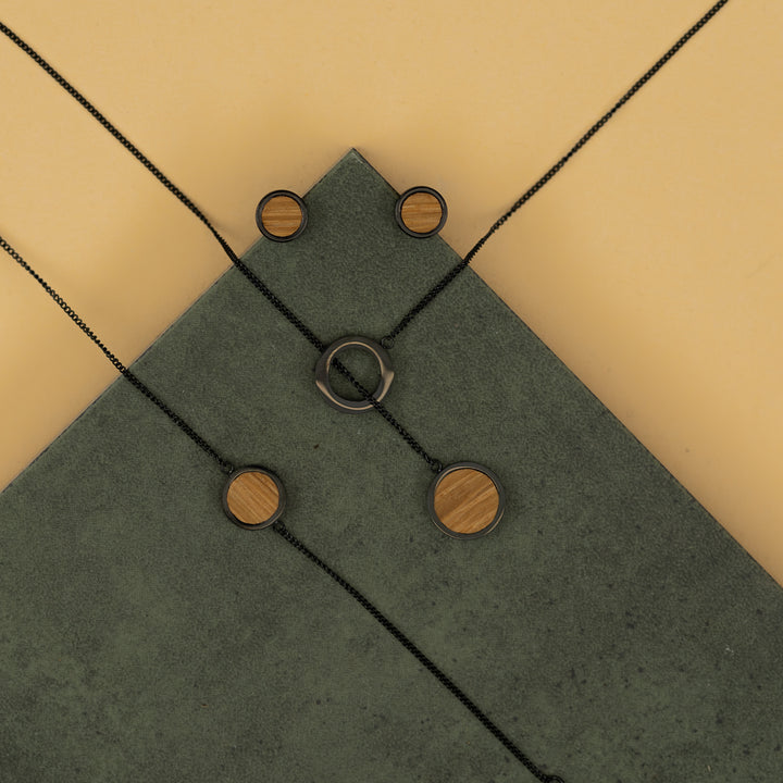 The Blachia jewelry set combines modern simplicity with natural materials. The round, clean shapes of the necklace and stud earrings are perfectly complemented by the deep dark, titanium carbide-plated stainless steel – durable, scratch-resistant, and timelessly modern.