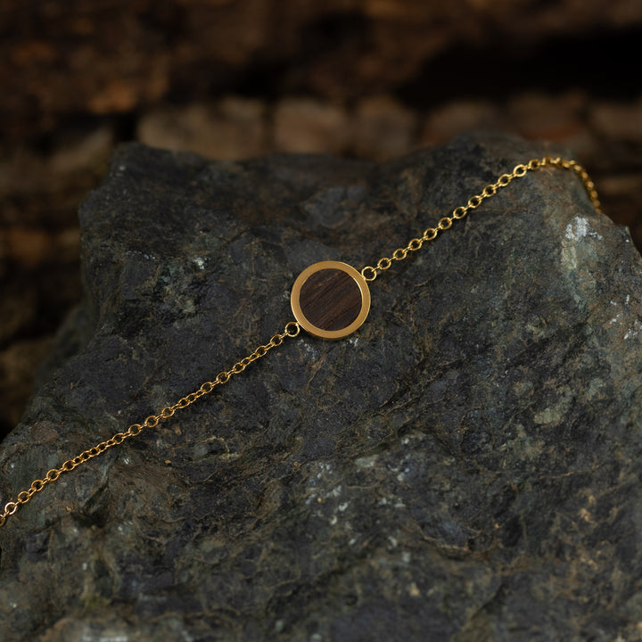 Das Aurelia Armband verbindet feines, zart schimmerndes Gold - 18 Karat plattiert - mit der warmen Tiefe edler Räuchereiche. Das dunkle Holz entfaltet durch die goldene Fassung einen spannenden Kontrast – ein zeitloses Schmuckstück, das Natürlichkeit und Eleganz in perfekter Balance vereint.