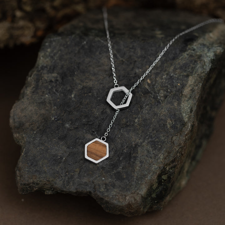Die Hexonix Nuss Halskette verbindet klare, geometrische Formen mit der warmen Maserung von Nussbaumholz. Ein hexagonales Element mit handverarbeiteter Nuss – in rhodiniertem Chirurgenstahl gefasst und an einer feinen, silberfarbenen Kette arrangiert.